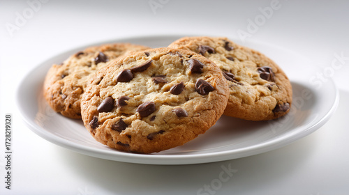 手前をフォーカスし白い皿に斜めに置かれた香ばしい焼き色の焼きたてチョコチップクッキー3枚