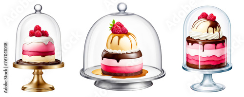 3 Luxury style ice cream cake bombe with layers of raspberry sorbet vanilla and chocolate, watercolor illustration, set of 3 cakes, covered with cake dome, vector clipart, food, sweet dish, ad promo