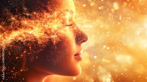 31. A professional is face with a backdrop of abstract technology, cloud computing, and innovation symbols