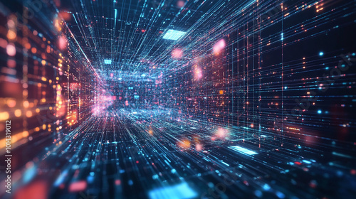 3D background of colorful neon lights emitting light, Abstract digital background with technology circuit board texture.