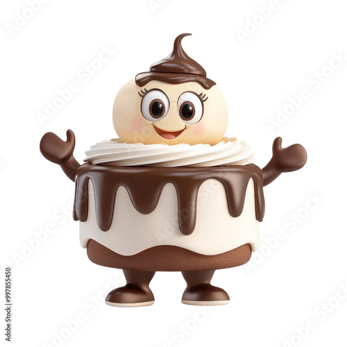 3D cartoon-style chocolate cake character isolated on white for a fun visual. PNG