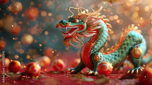 3d chinese dragon with a gold podium and red background, celebrating the new lunar year with festive illustrations, happy cny banners, and golden decorations perfect for party and celebration themes