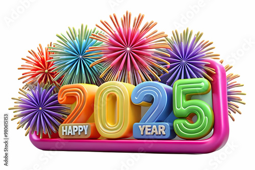 3D Colorful Fireworks Frame for Happy New Year 2025 - Vibrant Icon on Isolated White Background for Festive Celebrations