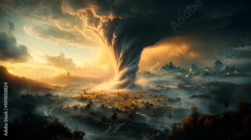3D depiction of a massive swirling tornado twisting through a rural landscape captured from an oblique high angle perspective using advanced 3D modeling and lighting