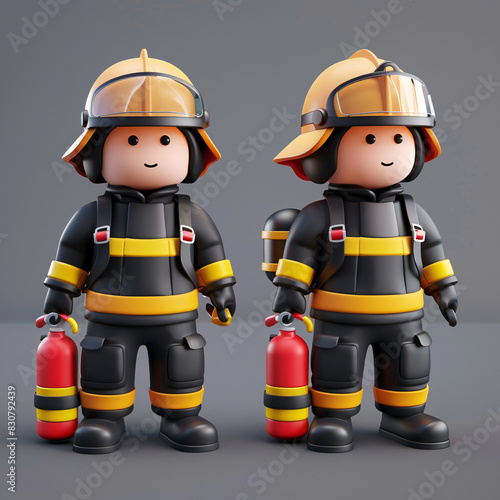 3D Firefighter: The firefighter cartoon mascot,wearing a bright red helmet and a sturdy uniform, embodies bravery and readiness. Equipped with fire extinguisher in one hand and a determined expression