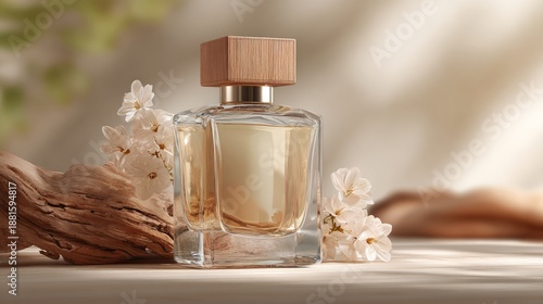 3d glass perfume bottle with wooden accents on beige and white background, showcasing natural woody fragrance, elegant minimalist cosmetic and beauty product photography for spa, salon, and luxury lif