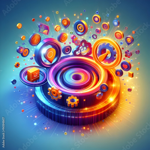 3D Glowing Abstract Marketing Icons with Vibrant Gradient Background - Captivating Visuals for Contemporary Marketing Strategies