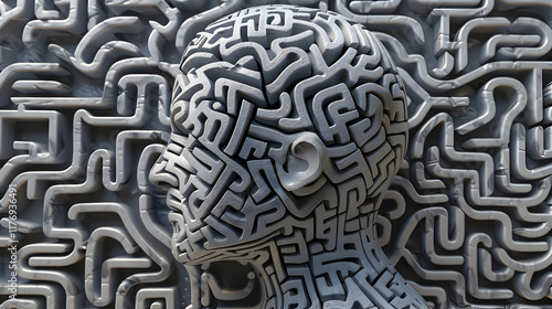 3D human head, maze structure with labyrinth-style brain, highly detailed gray maze patterns as background, macro photography