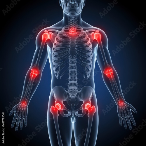 3D Human Skeleton with Highlighted Joint Pain Areas – Concept of Arthritis, Joint Inflammation, or Musculoskeletal Disorders Affecting the Shoulder, Elbow, Hip, and Knee