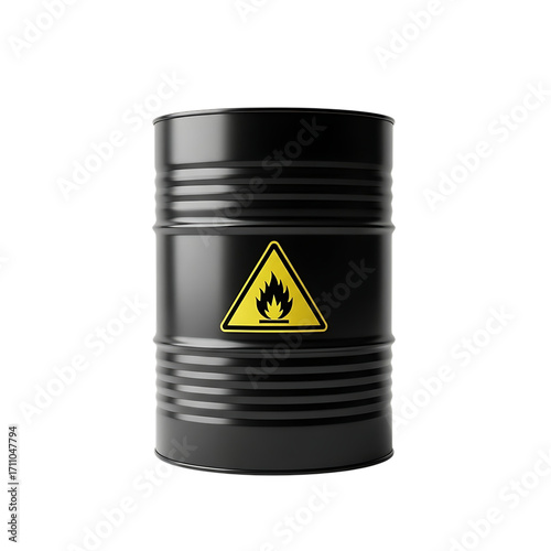 3d icon of black metal barrel with flammable liquid warning sign isolated on transparent background
