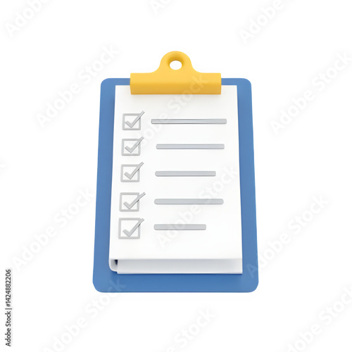 3D illustration of a checklist clipboard with blue frame and yellow clip, ideal for productivity or task management themes