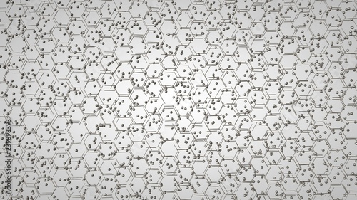 3D illustration of a graphene grid, a carbon molecule disintegrated into a set of chaotic elements, nodes. Chaos of chemical compound. 3D rendering on white background