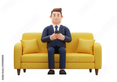 3D Illustration of Cartoon businessman sitting on a yellow sofa using a smartphone isolated on white background close to 102 characters