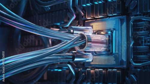 3D Illustration of Optical Fiber Cable with Computer Processor