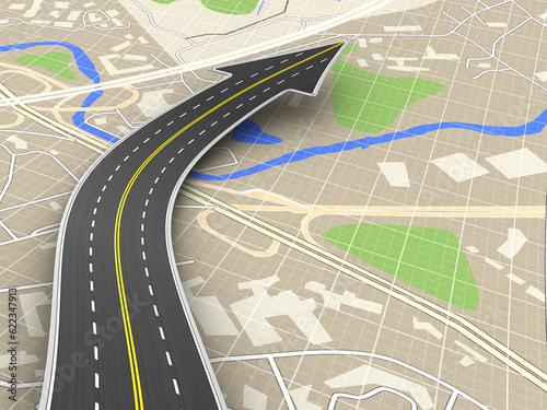 3d illustration of road with arrow sign over map