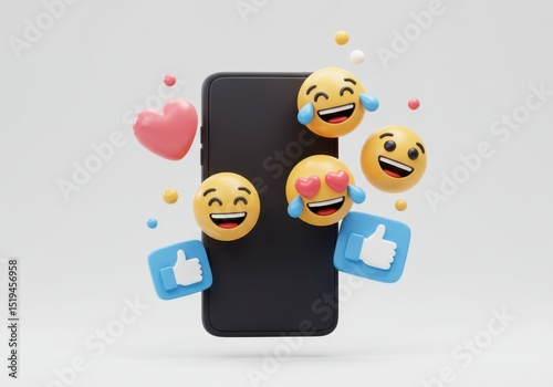 3D Illustration of Smartphone surrounded by floating emojis, a heart, and like icons isolated on white background