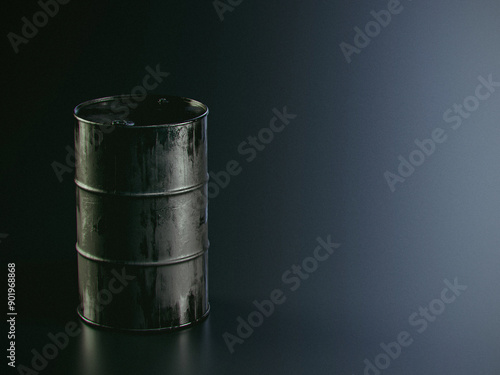 3d illustration of used soiled oil barrel isolated on dark background. Oil drum