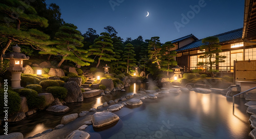 3D image Japanese Ones Garden at Night with Steaming Hot Spring, Lantern Lighting, Pine Trees, Tranquil Architecture, and Serene Nature Harmony.