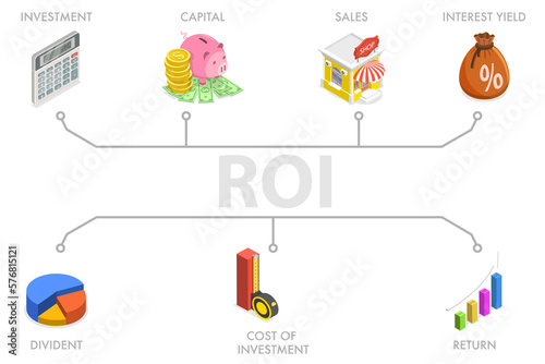 3D Isometric Flat Conceptual Illustration of Return on Investment, ROI.