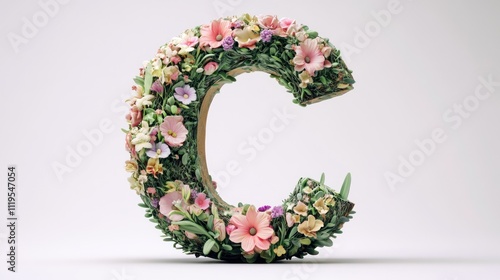 3D letter 'C' covered in intricate flower designs and delicate floral details, studio lighting, transparent background