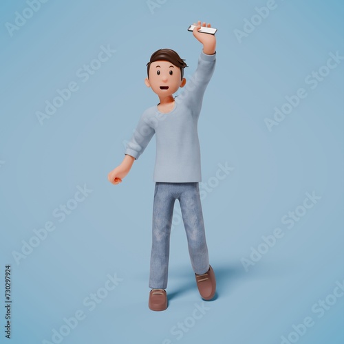 3d man walking and shouting while raising his left hand with his cellphone in his hand