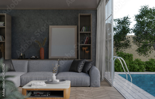 3D mockup blank photo frame in living room rendering