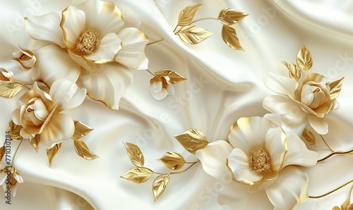3D mural wallpaper flowers in gold and cream colors high quality AI generated image
