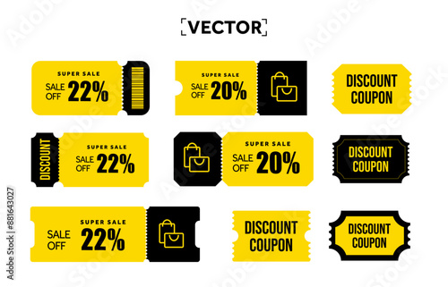 3d pack of coupons in yellow color, shopping icon, barcode and shape, coupon code. Coupon set isolated on white background. Voucher template for special promotion. 3d Vector illustration. Vector