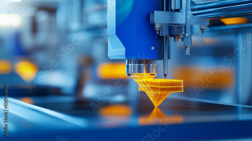 3D printing technology is showcased with close up of printer nozzle creating detailed object. vibrant orange glow highlights precision and innovation in manufacturing