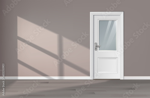 3d realistic vector illustration. Empty room with white entry door and sunlight on the wall.