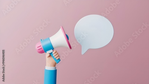3D Render Hand Holding Megaphone with Speech Bubble/Text Balloon on Pink Background, Minimalist Marketing Visuals, Marketing Concept Announcement Background Copy Space Illustration.