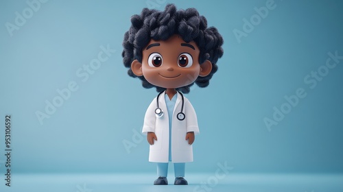 3D render of a full body cartoon character, black doctor, isolated on a blue background.