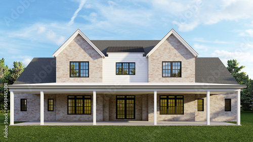3D Render of a Modern Two-Story House Exterior with Large Covered Porch, Brick Walls, and Black-Framed Windows – Architectural Visualization and Real Estate CGI