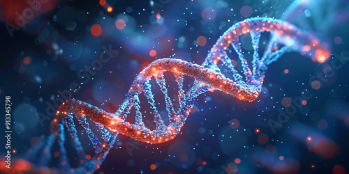 3D render of DNA double helix with glowing particles. Biotechnology and scientific concept for genetic research and molecular science