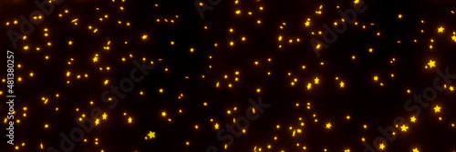 3D Render of many small yellow orange particles flying on black festive background. Trendy backdrop for your design. Banner, three-dimensional illustration