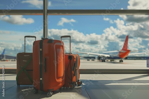 3D render of two suitcases and travel bag near the window in airport with airplane on background, close up.
