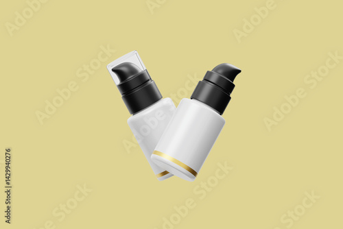 3D Render Two white skincare bottles with black pumps on a beige background