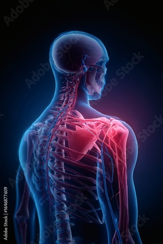 3D rendered illustration of the human body showing an X-ray of the spine and various anatomical structures