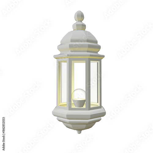 3D rendered white Ramadan lantern with a light inside, isolated on a white background. Elegant Islamic decorative lamp perfect for Ramadan Kareem and Eid Mubarak greeting cards, banners.