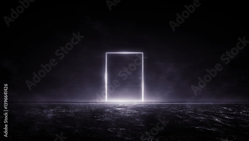 3D Rendering Abstract Door light fantastic scene. empty stage, room with light element, neon light, abstract light. Reflection on the wet surface of neon light.