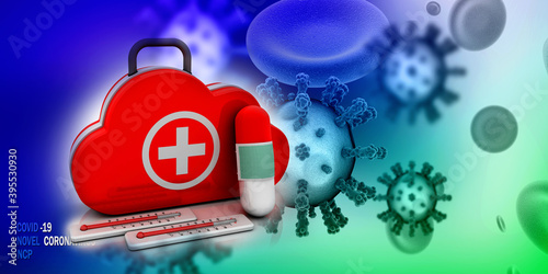 3d rendering First aid kit in cloud with mask protected pill near thermometer