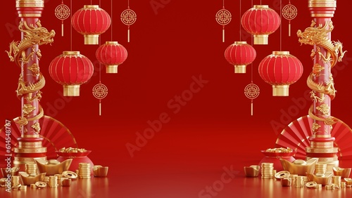 3d rendering illustration background for happy chinese new year 2024 the dragon zodiac sign with red and gold color, flower, lantern, and asian elements. ( Translation : year of the dragon 2024 ).