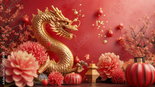 3d rendering illustration background for happy chinese new year 2024 the dragon zodiac sign with red and gold color, flower, lantern, and asian elements. Translation : year of the dragon 2024