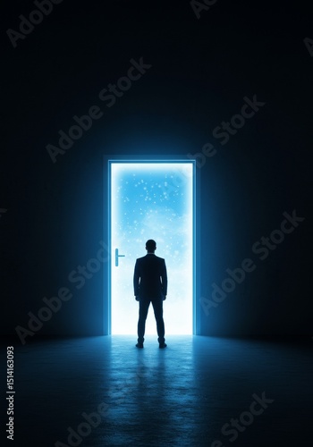3d Rendering Man Silhouette Stands Before Glowing Doorway to Future
