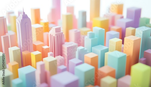 3D rendering of a cityscape made from pastel pink, purple, and yellow blocks