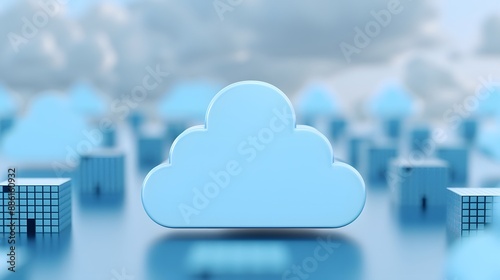 3D rendering of a cloud computing concept with floating clouds and buildings in the background, symbolizing cloud storage and technology.