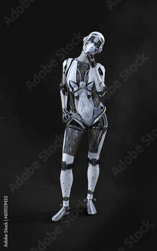 3D rendering of a female android robot posing on black background with clipping path.