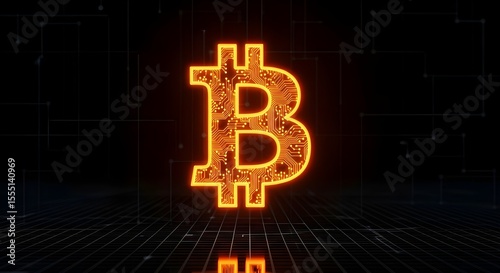 3D rendering of a neon bitcoin sign on a dark background with highlights