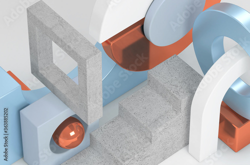 3d rendering of an abstract composition. Minimalistic geometric shapes in empty space and objects of different shapes. Visualization of matte and shiny geometric shapes on a uniform background.