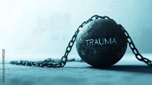 3D rendering of an iron ball with the word "TRAUMA" engraved on it,